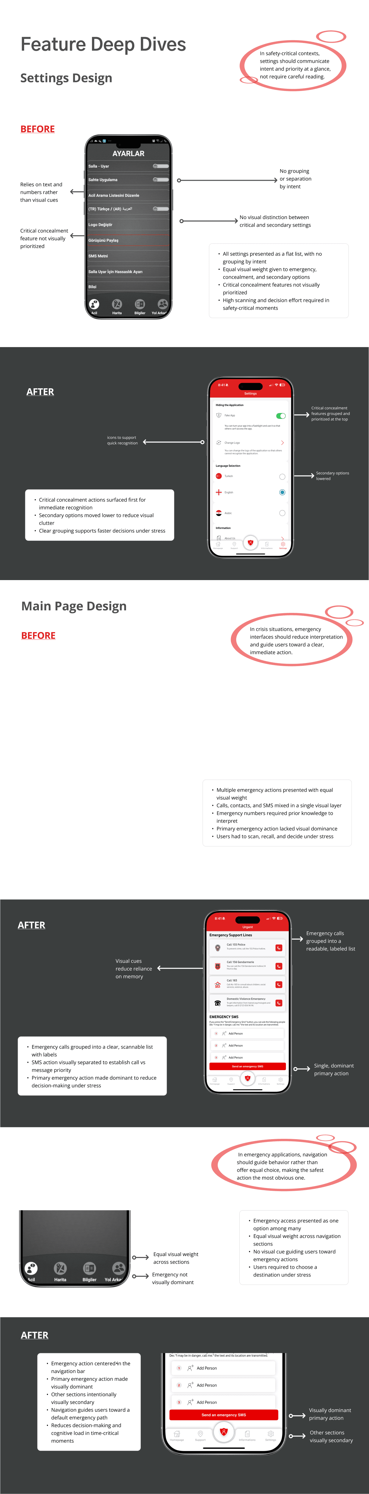 This case study explores hidden and emergency interaction design in a real-world, safety-critical mobile application supporting women experiencing or at risk of violence. It focuses on improving key emergency interactions, including the homepage emergency button and flashlight-based concealment, through sketching, iteration, and redesign.